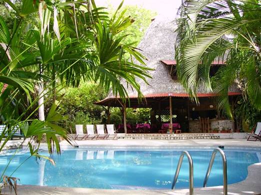Hotel Celaje offers seven two-story, A-frame cabins with thatched roofs and chalet-style wooden interiors. Each has a bedroom upstairs and a bathroom, storage space, and patio downstairs (kind of dangerous for those of us who get up in the middle of the night to go to the bathroom, but oh well). The bedrooms have a double and a single bed, a big window looking onto the garden and, since there's nothing else up here, plenty of room. The cabins are arranged in a wide arc around a free-form swimming pool and a little stream that runs down to the beach. Tall coconut palms stand all around. The hills that crowd down to the beach around Montezuma have receded a kilometer or more inland here, and the land is flat and lazy. Crested jays forage in the trees, but other than that the air is still.
