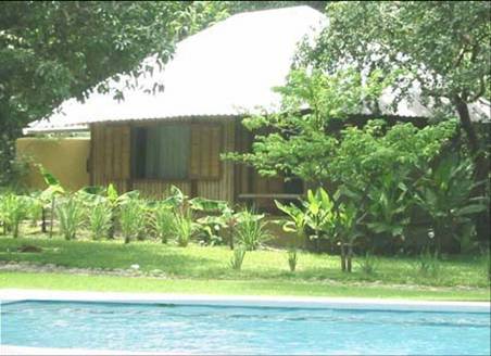 Ylang-Ylang Lodge offers six bungalows, each two-story with the bedroom and a shaded deck upstairs to take full advantage of the continuous breeze between the mountains and the sea. The spacious pool-side rancho is decorated with Olivier's fanciful driftwood artworks, including an enormous mobile of planetary orbits filling the peak of the thatched roof. Miró meets Calder in the back of beyond. The beach is a 15 minute walk away. Perfect for a sea-side yoga retreat.